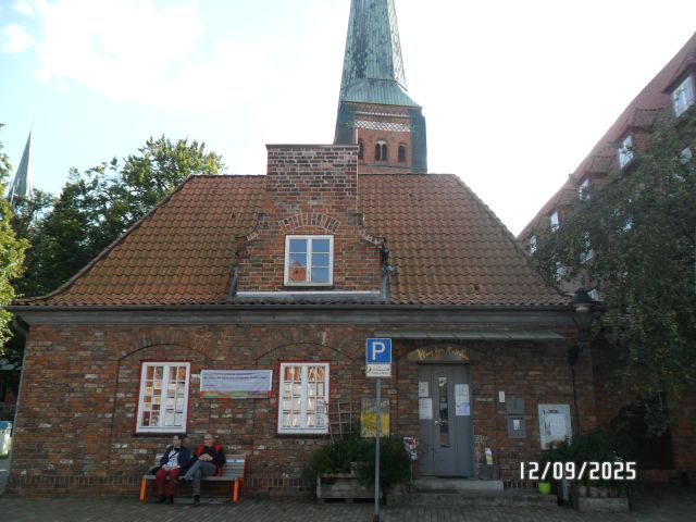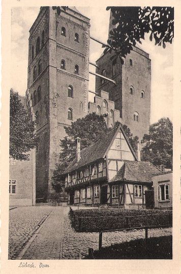 Das kleine Fachwerkhaus vor dem Dom in Lübeck überstand zunächst den Bombenangriff an Palmarum 1942, wurde dann aber leider am Tag danach durch die einstürzenden Turmhelme des Doms zerstört, die inzwischen Feuer gefangen hatten.