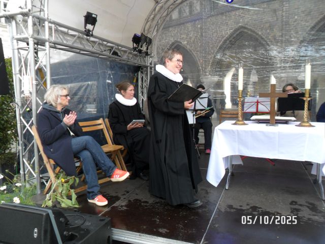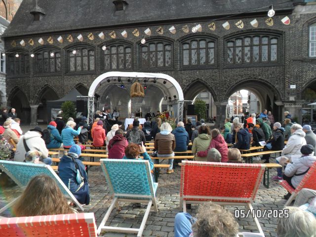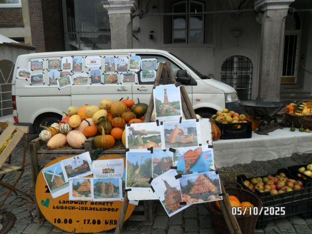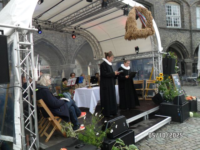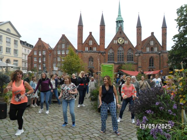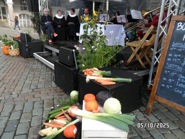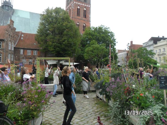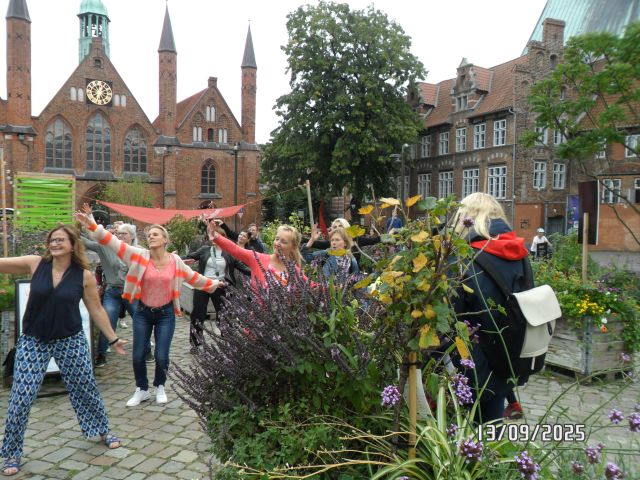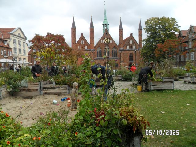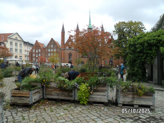 Lübeck feiert das ÜBERGANGSWOCHENENDE am 4. und 5. Oktober 2025 in der Lübecker Innenstadt. Gottesdienst auf dem Markt, Ernte im ÜBERGANGSGARTEN (Abernten Koberg). Lübeck zeigt, wie Wandel gestaltet werden kann. Am Sonntag, 5. Oktober, beginnt der Tag um 12 Uhr mit dem traditionellen Open-Air-Erntedankgottesdienst der Innenstadtgemeinde St. Marien – unter dem Motto „mehr fürs meer“. Gemeinsam gestalten Pröpstin Petra Kallies und die St. Marien-Pastorin Inga Meissner einen interessanten Gottesdienst zu den Gaben der Schöpfung. Mit dabei das Lübecker Blechbläser-Ensemble, Leitung Britta Nolte. Das Team „KranzGenau“ gibt Anleitungen, wie man dekorative Flower Hoops selber macht. Zum feierlichen Finale spielt das Blasorchester Frederiksborg Drabantgarden um 14 Uhr ein letztes Platzkonzert unter freiem Himmel (Übergangswiese, Schrangen).