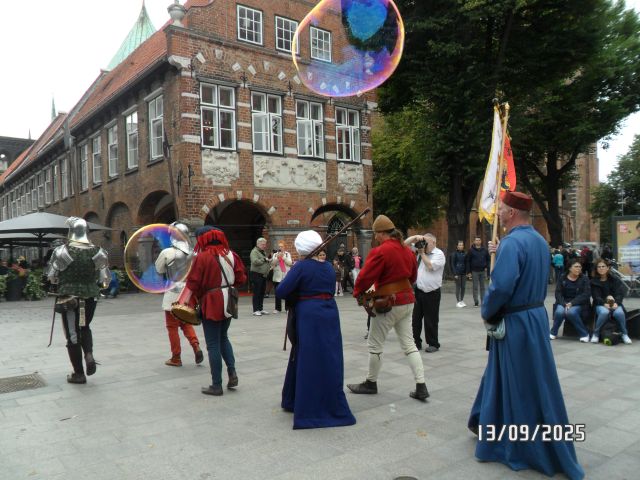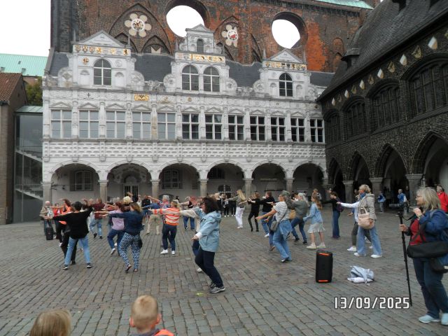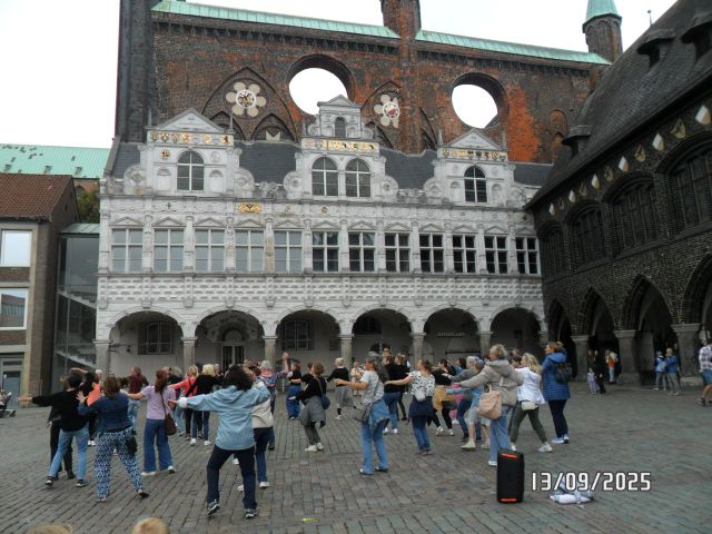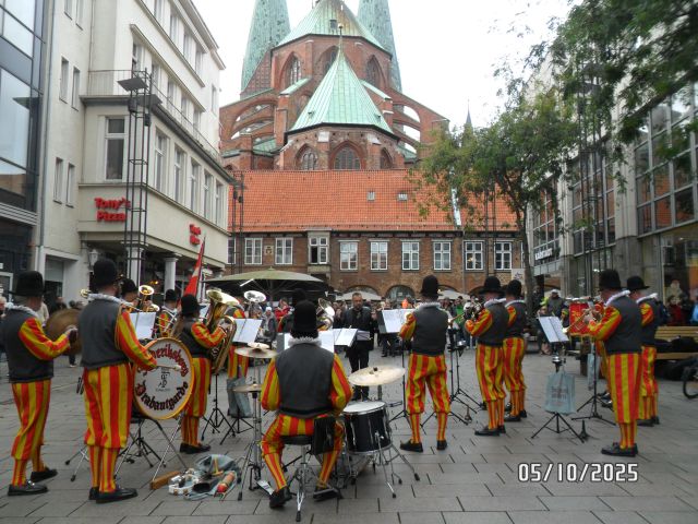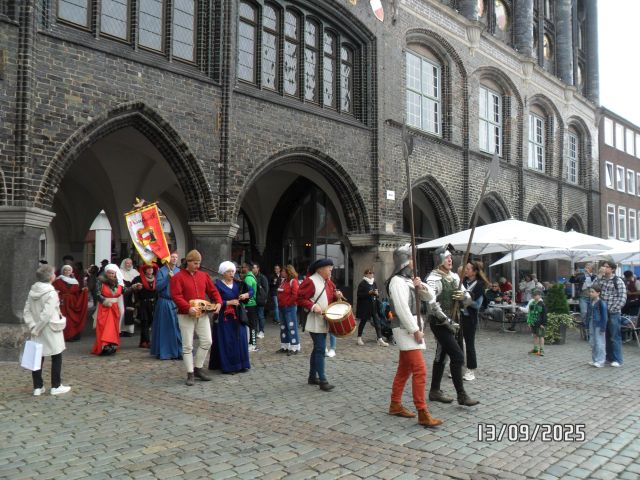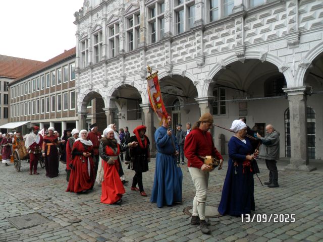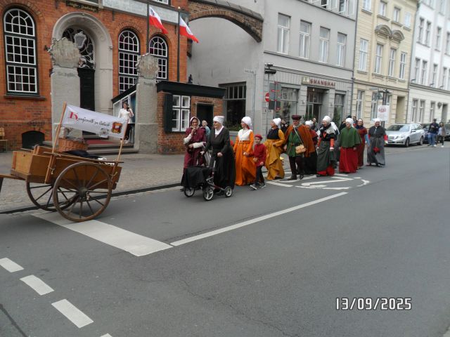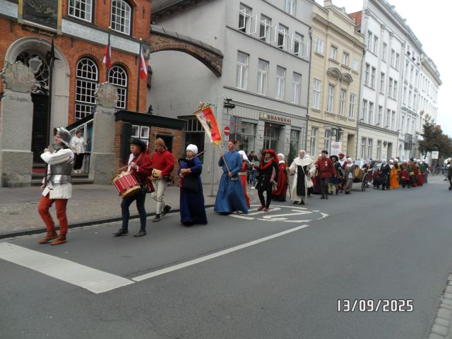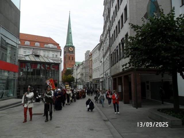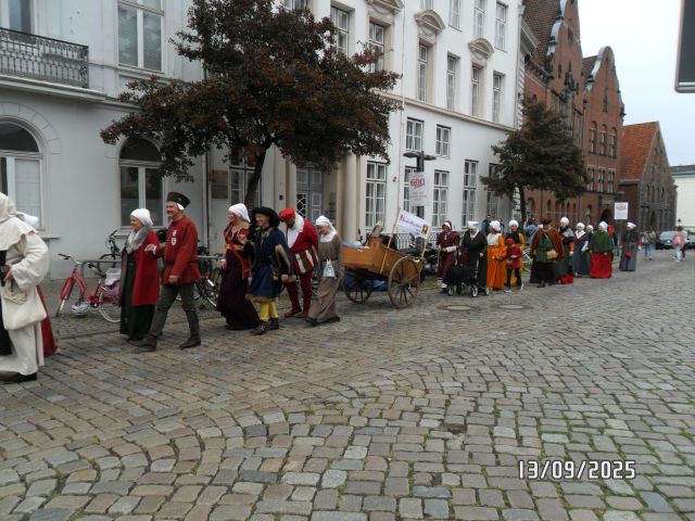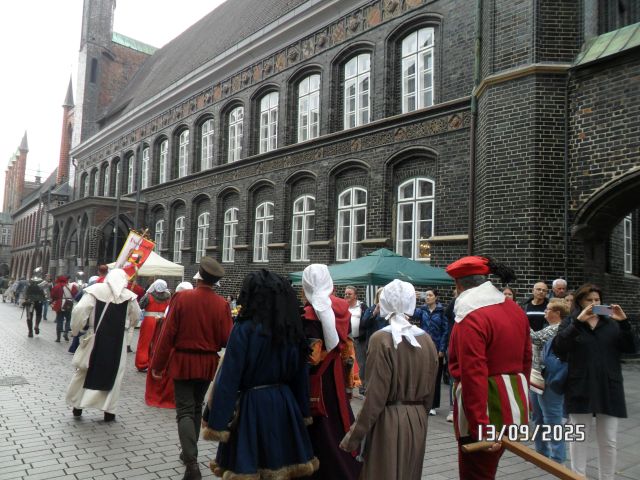 Seit seiner Gründung im Jahr 2000 widmet sich das Hansevolk zu Lübeck (gemeinnützig) e. V. der lebendigen Darstellung und Vermittlung des mittelalterlichen Lebens in der Hansestadt Lübeck. Dieses Jahr feiert der Verein sein 25-jähriges Bestehen. Die Feierlichkeiten zum Jubiläum finden am Samstag, 13. September 2025, statt. Nach einem Umzug in historischen Gewändern durch die Stadt empfängt Jan Lindenau, Bürgermeister der Hansestadt Lübeck, die Vereinsmitglieder im geschichtsträchtigen Rathaus. Ein würdiger Rahmen für den Verein, der sich der Hansegeschichte mit so viel Engagement widmet. Sehenswürdigkeiten in Lübeck im Hintergrund: Koberg mit Ernestinenschule, Schiffergesellschaft, Breite Straße mit Kirche St. Jakobi (Jakobikirche), Kanzleigebäude mit 2 Seifenblasen, Eingang Rathaus, Marktplatz mit Rathaus.