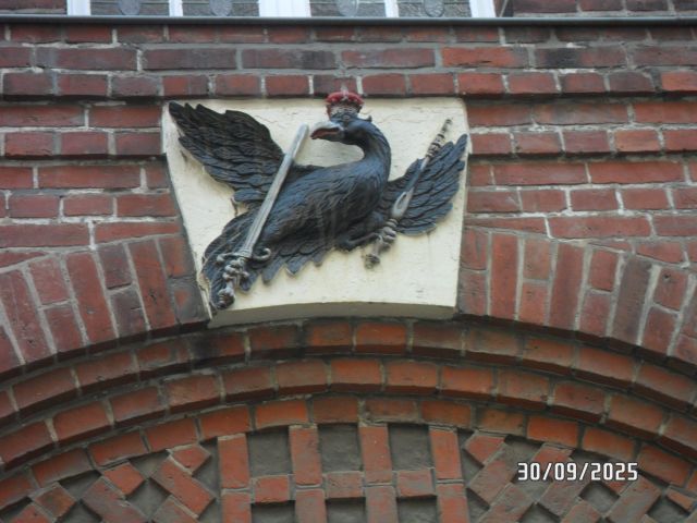 Mosaik mit dem Lübecker Wappen am Brückenturm der Hubbrücke an der Mündung des Travekanals in die Trave bei Lübeck.
